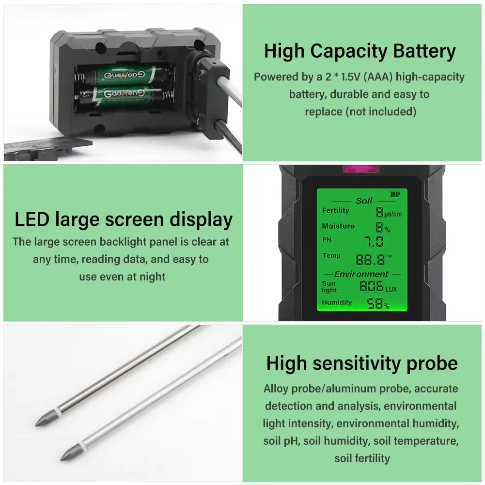 Professional 6-in-1 Soil Meter Soil PH/Fertility/Temperature/Moisture/Environmental Humidity/Light for Plant